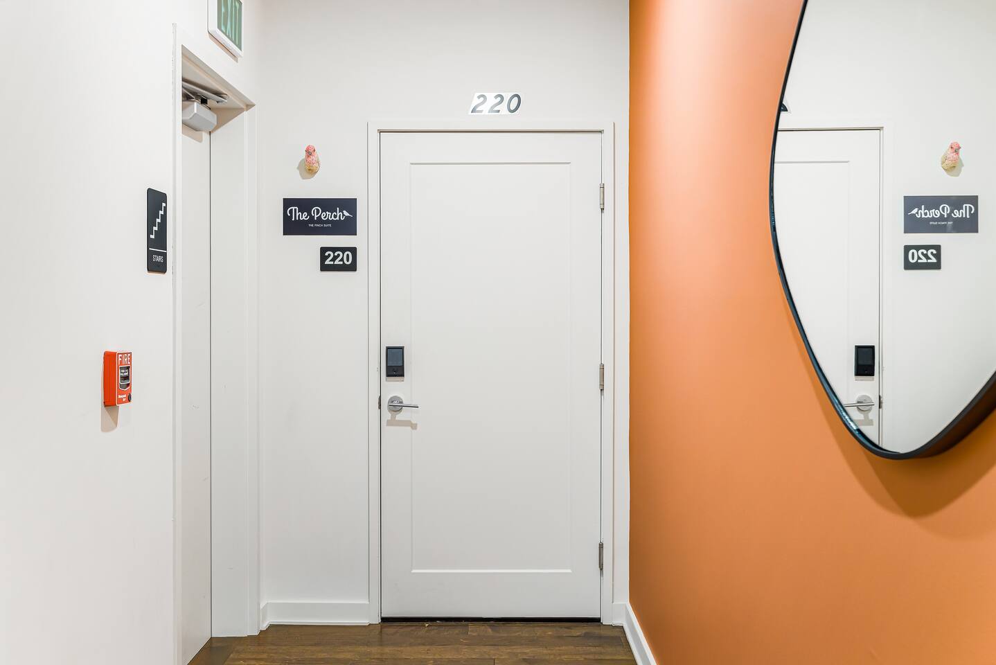 The Perch is located steps away from a paved 3.8-mile walking path, the Reed Creek Greenway, a quiet trail surrounded by trees and natural flora. The Greenway spans from near downtown through UNC Asheville’s campus, ending in Weaver Park. Tucked to the side of the trail near campus, you’ll find the entrance to the Asheville Botanical Gardens, where nature trails run alongside Reed Creek. At just over 1,000 square feet on the second floor, the Finch Suite’s (#220) spacious open floorplan is flooded with natural light from our floor-to-ceiling windows. With king beds in both bedrooms and two full baths, we can luxuriously accommodate 4 guests—you will feel pampered! The comfortable living room sectional faces a flat-screen TV—bring your streaming logins, kick back, and relax. If you’re looking for some family activities, in the console under the TV you’ll find a variety of great family-friendly games, including Wingspan, Skull, Uno, and a deck of playing cards. The kitchen is fully stocked with pots, pans, silverware, plates, and all the other items you need to make a home-cooked meal. Our spice rack covers all the bases! We have special plates and cups for the kiddos, and you’ll find a separate set of plastic dishes and grill tools so you can fire up the rooftop grill for a summer cookout! We also provide a coffee and tea cabinet with ground coffee, a coffee maker, black and herbal teas, and a selection of flavored creamers. We’ve got you covered on amenities! Each bathroom is ready for all your needs with a blow dryer, towels, makeup washcloths, soaps and shower supplies. You’ll also find extra amenities like an in-suite-washer-dryer, pack-and-play, and iron/ironing board. Don’t miss the shared rooftop deck, one of the highlights. As you drive up to the property, you can’t miss our stunningly eye-catching rooftop mural by Wyatt Grant. Enjoy it up close and personal while you sit around the firepit, “perched” high above the neighborhood (we couldn’t resist!) We are a fully accessible property, so you can access your suite seamlessly via elevator from the ground floor up to your suite. We offer parking on-site, which is shared with the retail space on our ground floor. Self-check in is easy with our keyless lock systems. We’ll message you ahead of time with your unique lock code, changed between guests every time for your security.