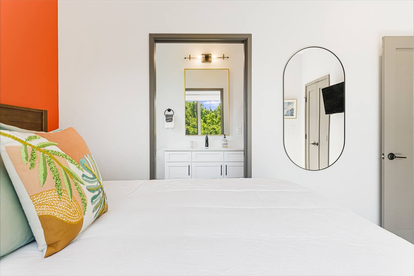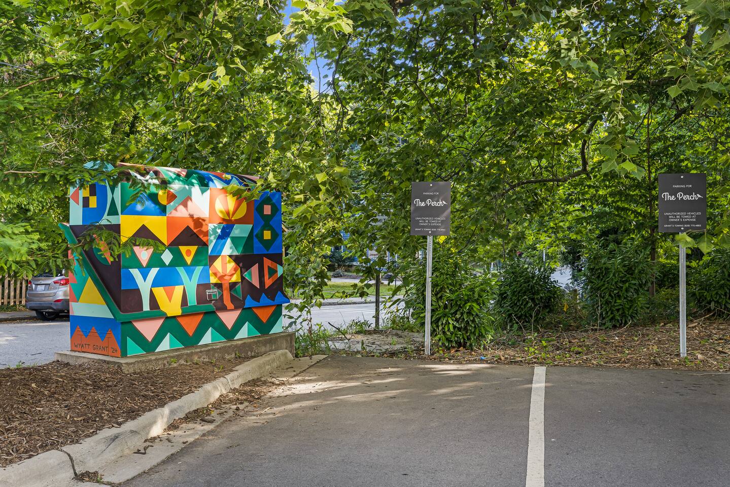The Perch is located steps away from a paved 3.8-mile walking path, the Reed Creek Greenway, a quiet trail surrounded by trees and natural flora. The Greenway spans from near downtown through UNC Asheville’s campus, ending in Weaver Park. Tucked to the side of the trail near campus, you’ll find the entrance to the Asheville Botanical Gardens, where nature trails run alongside Reed Creek. At just over 1,000 square feet on the third floor, the Kingfisher Suite’s (#320) spacious open floorplan is flooded with natural light from our floor-to-ceiling windows. With king beds in both bedrooms and two full baths, we can luxuriously accommodate 4 guests—you will feel pampered! The comfortable living room sectional faces a flat-screen TV—bring your streaming logins, kick back, and relax. If you’re looking for some family activities, in the console under the TV you’ll find a variety of great family-friendly games, including Wingspan, Skull, Uno, and a deck of playing cards. The kitchen is fully stocked with pots, pans, silverware, plates, and all the other items you need to make a home-cooked meal. Our spice rack covers all the bases! We have special plates and cups for the kiddos, and you’ll find a separate set of plastic dishes and grill tools so you can fire up the rooftop grill for a summer cookout! We also provide a coffee and tea cabinet with ground coffee, a coffee maker, black and herbal teas, and a selection of flavored creamers. We’ve got you covered on amenities! Each bathroom is ready for all your needs with a blow dryer, towels, makeup washcloths, soaps and shower supplies. You’ll also find extra amenities like an in-suite-washer-dryer, pack-and-play, and iron/ironing board. Don’t miss the shared rooftop deck, one of the highlights. As you drive up to the property, you can’t miss our stunningly eye-catching rooftop mural by Wyatt Grant. Enjoy it up close and personal while you sit around the firepit, “perched” high above the neighborhood (we couldn’t resist!) We are a fully accessible property, so you can access your suite seamlessly via elevator from the ground floor up to your suite. We offer parking on-site, which is shared with the retail space on our ground floor. Self-check in is easy with our keyless lock systems. We’ll message you ahead of time with your unique lock code, changed between guests every time for your security.