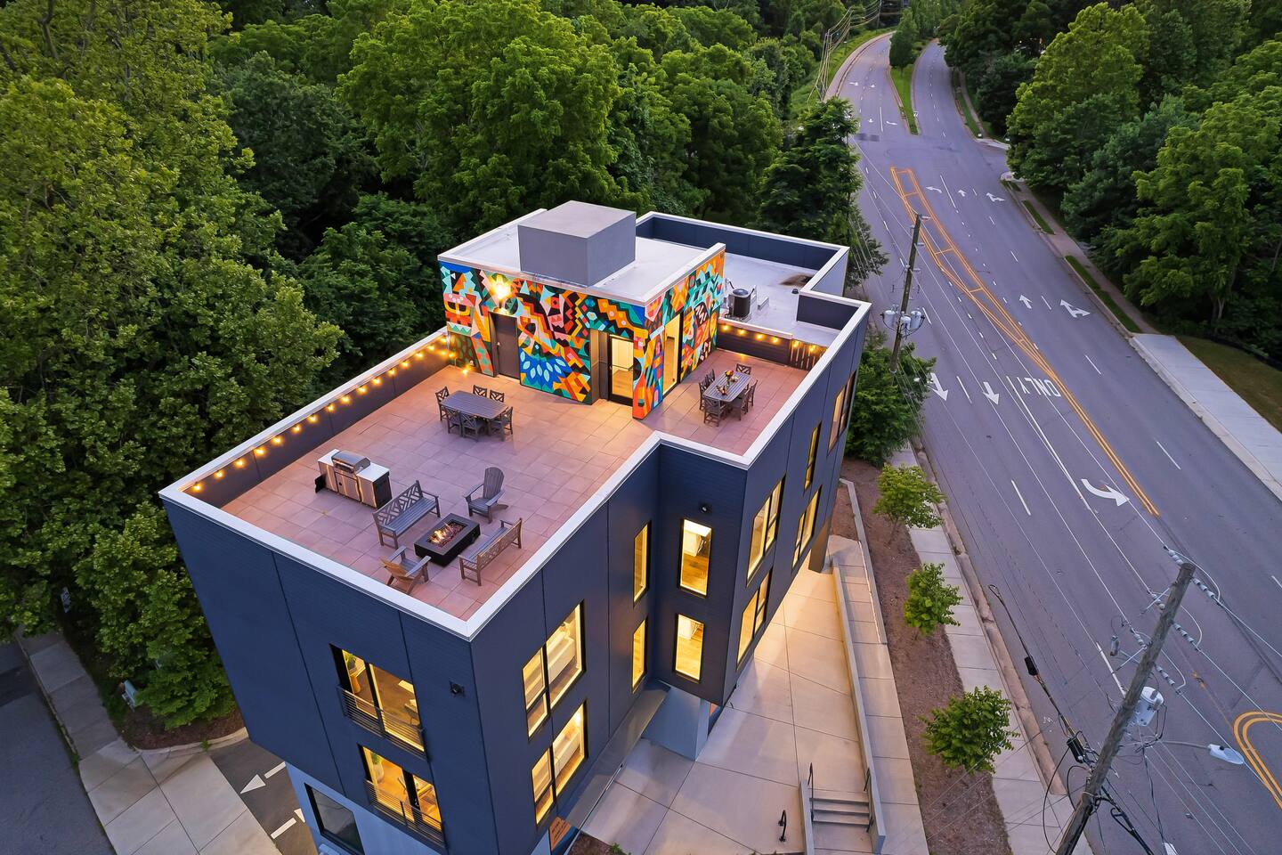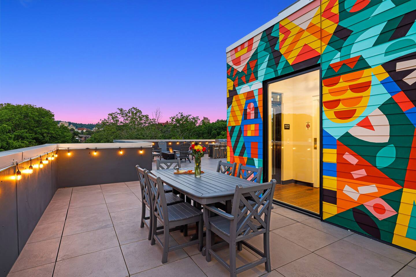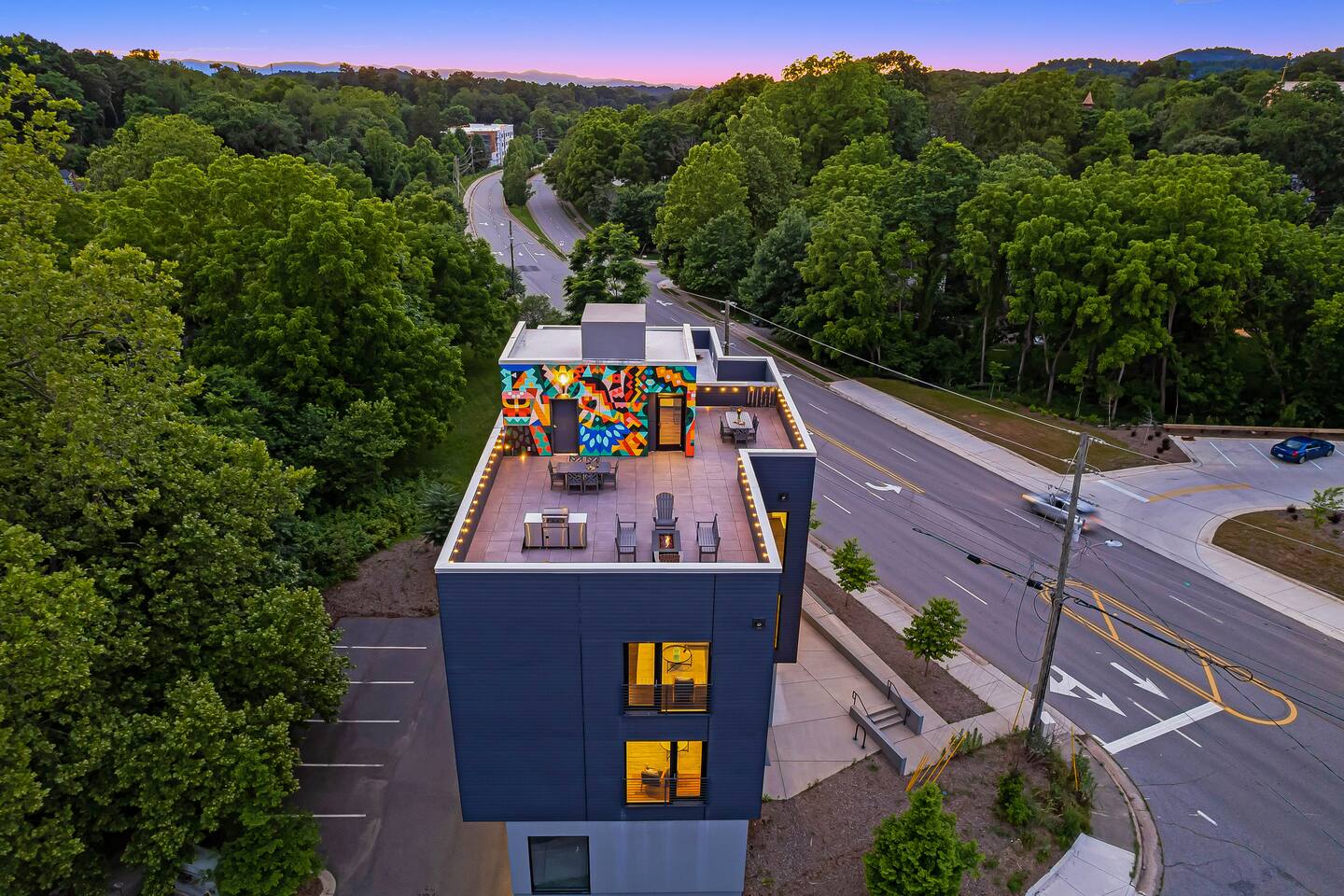Welcome to the Kingfisher Suite at @PerchAVL! Ideal for families and friends; style and location collide in this newly constructed loft within walking distance of downtown Asheville, NC. At The Perch, Asheville’s famous murals don’t stop on the street—your suite is packed with pops of color and around the property you’ll see hand-painted murals and art from Wyatt Grant. Warm Evenings can be spent on the rooftop deck boasting city views, a firepit, gas grills, and ample seating for cookouts.